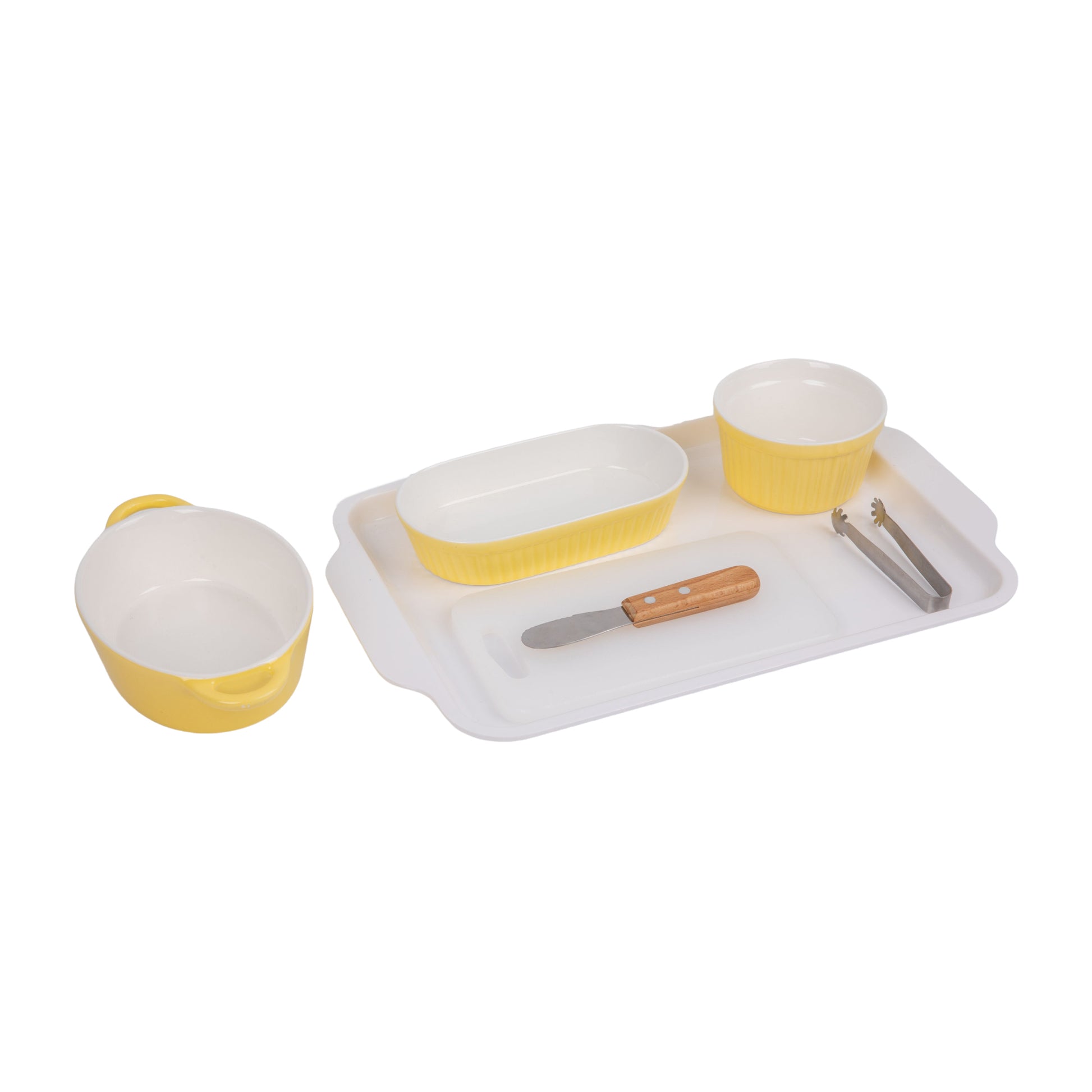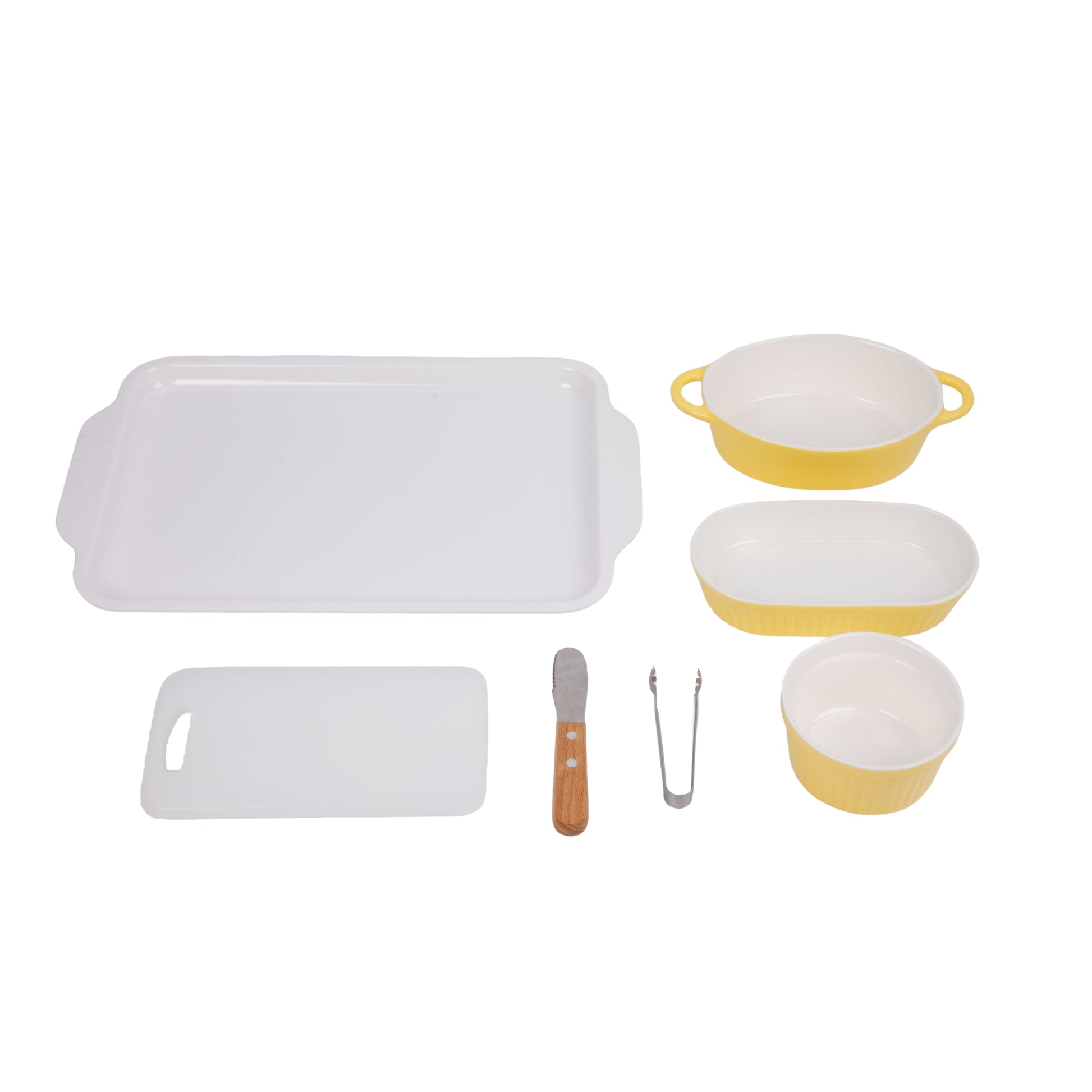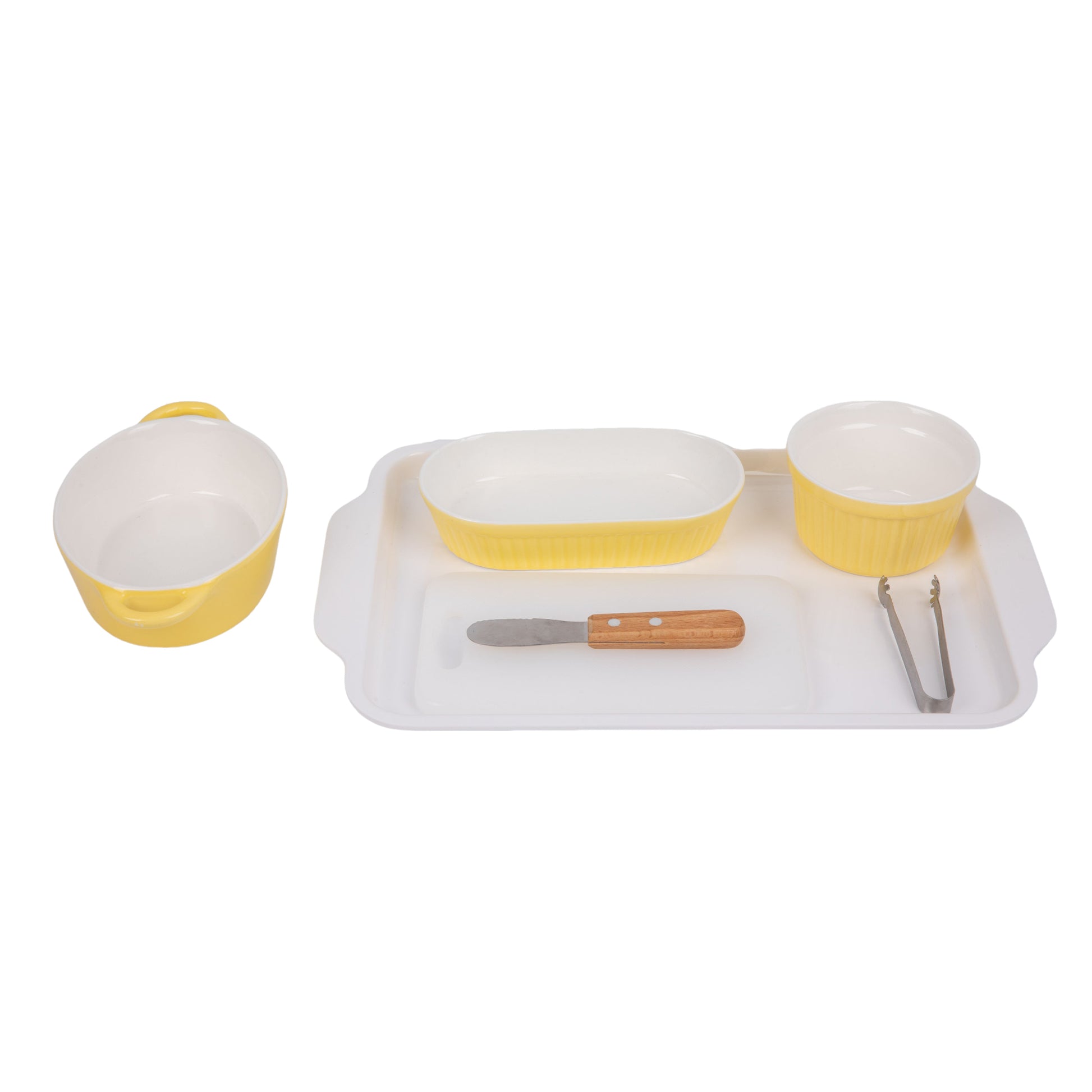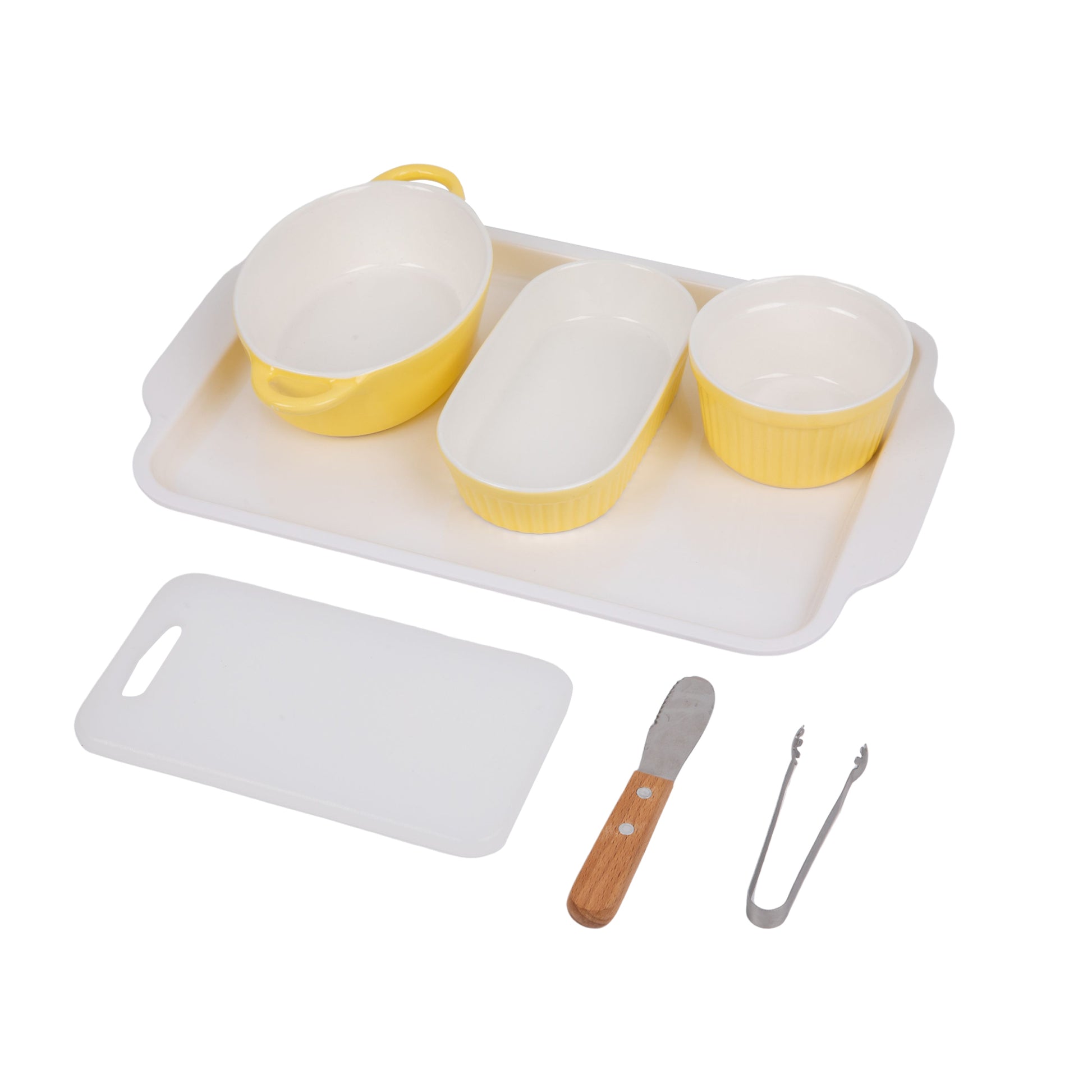 A ceramic holding bowl, a large plastic tray includes a long elliptical bowl,a round bowl, a knife and a cutting board.a clip is included.