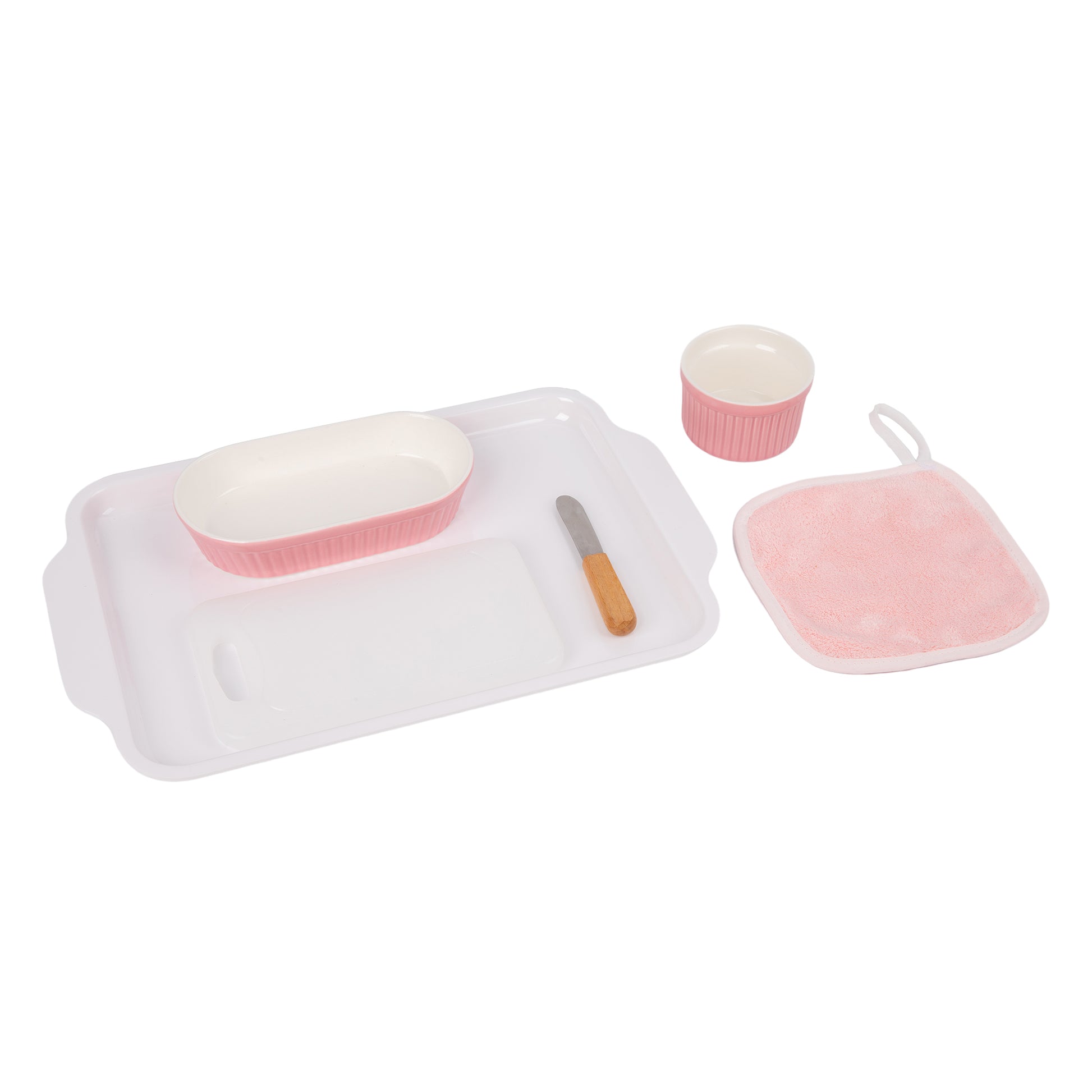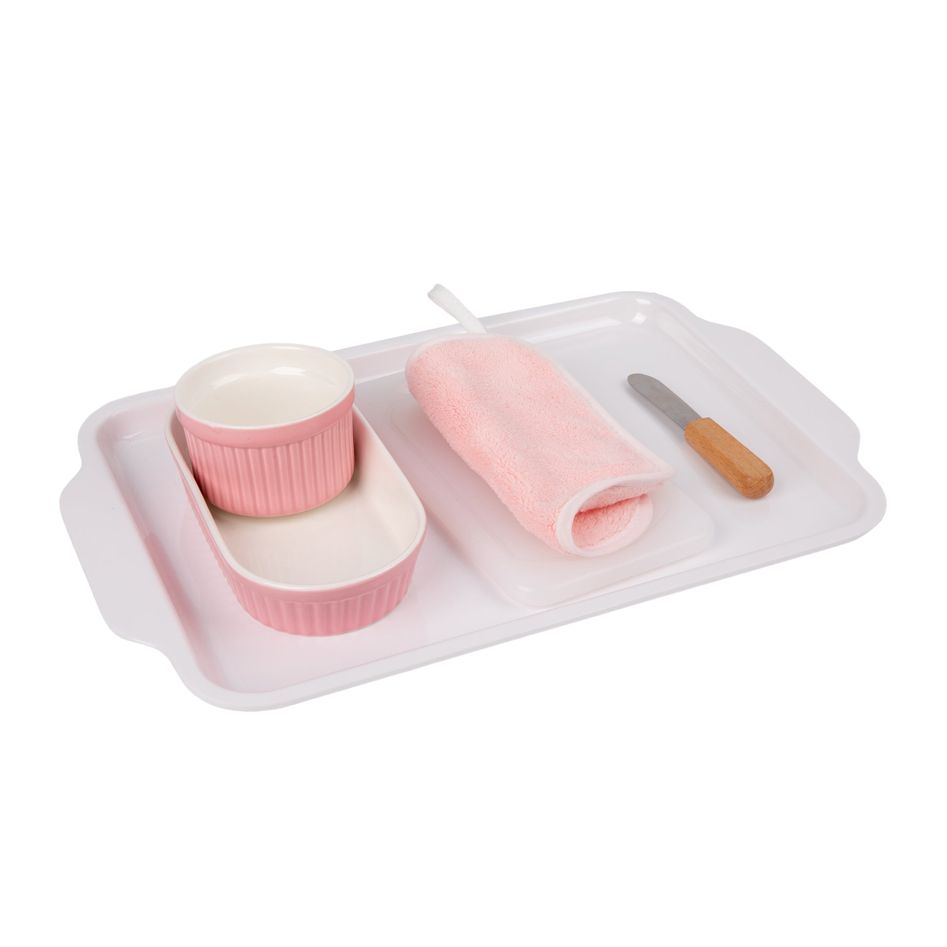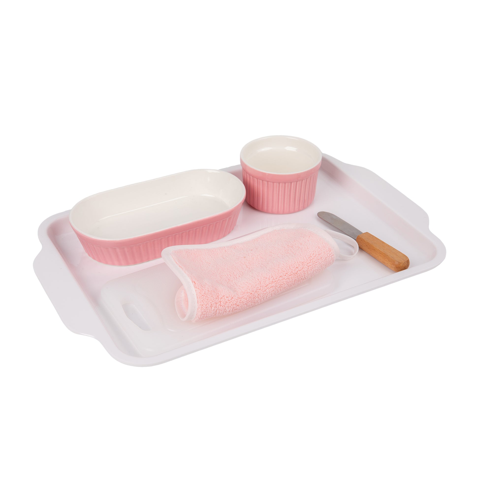 A large plastic tray includes a long elliptical bowl, a round bowl , a cutting board, and a drying cloth, a spatula is included.