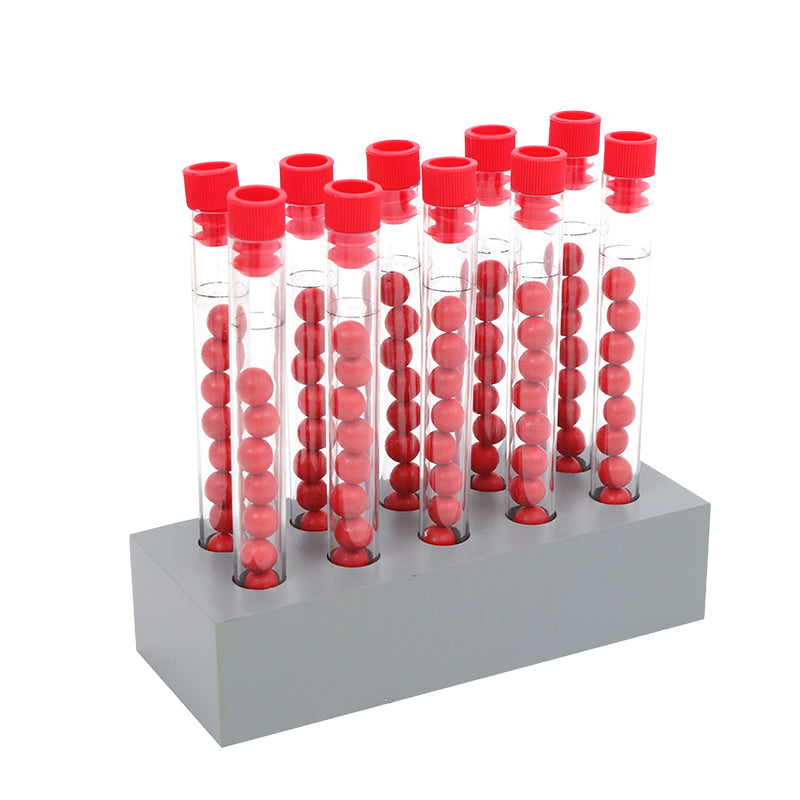 The set consists: 4 color-coded division boards and a wooden tray which holds seven racks of tubes with beads, 7 cups, and 36 skittles.