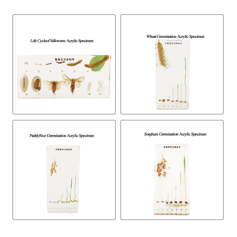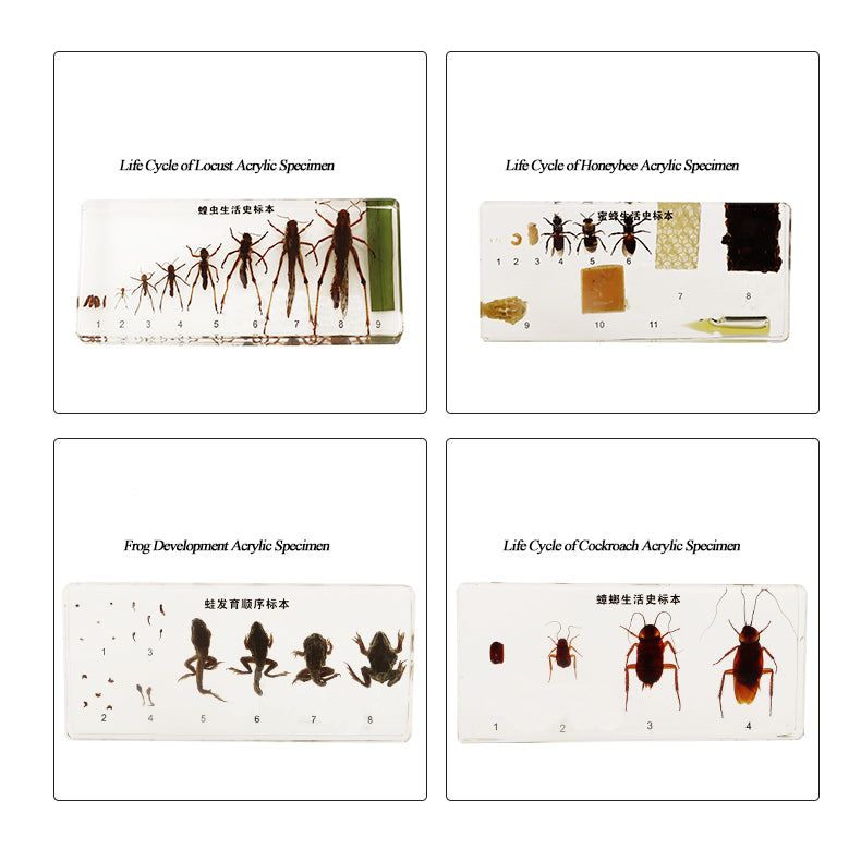 This comprehensive educational tool showcases the full life cycle of insect, from egg to adult. Each stage is clearly displayed and encased in break-proof acrylic, making it perfect for classrooms, laboratories, and personal collections. The durable acrylic ensures that each specimen is preserved and protected, allowing for unobstructed viewing from every angle.