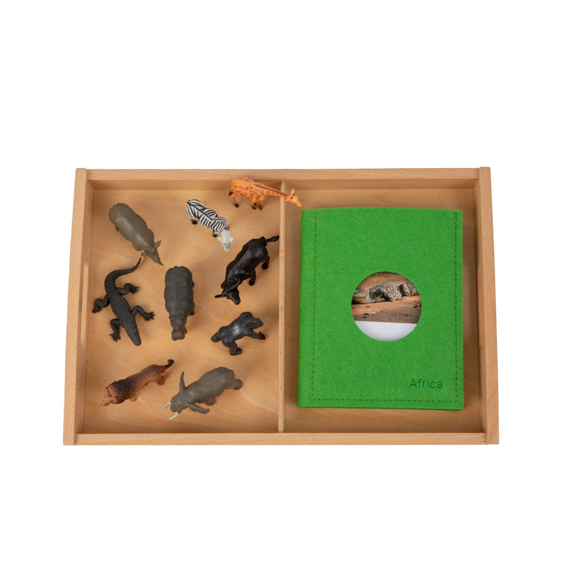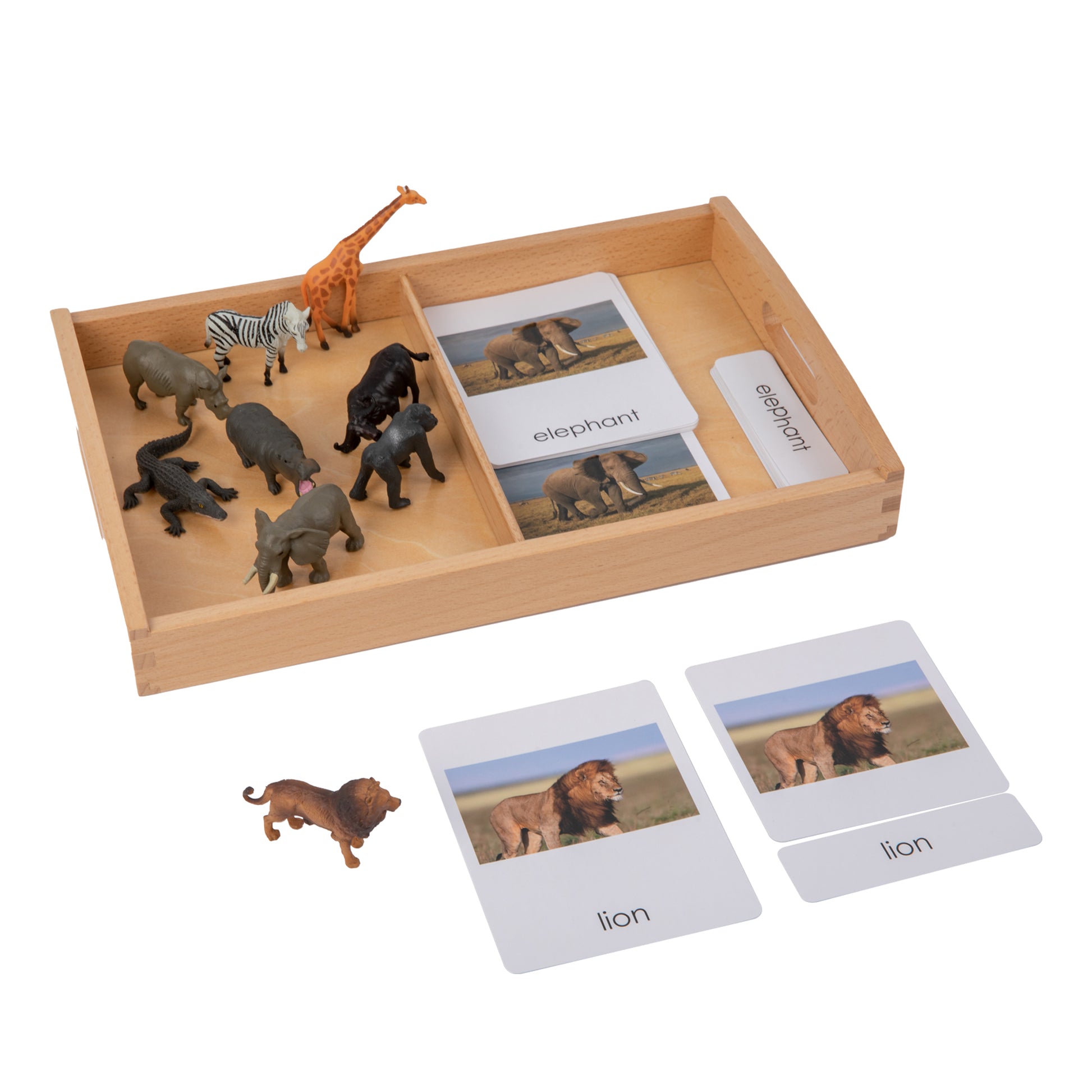 A wooden tray contained a set of sorting cards and matching animal objects.