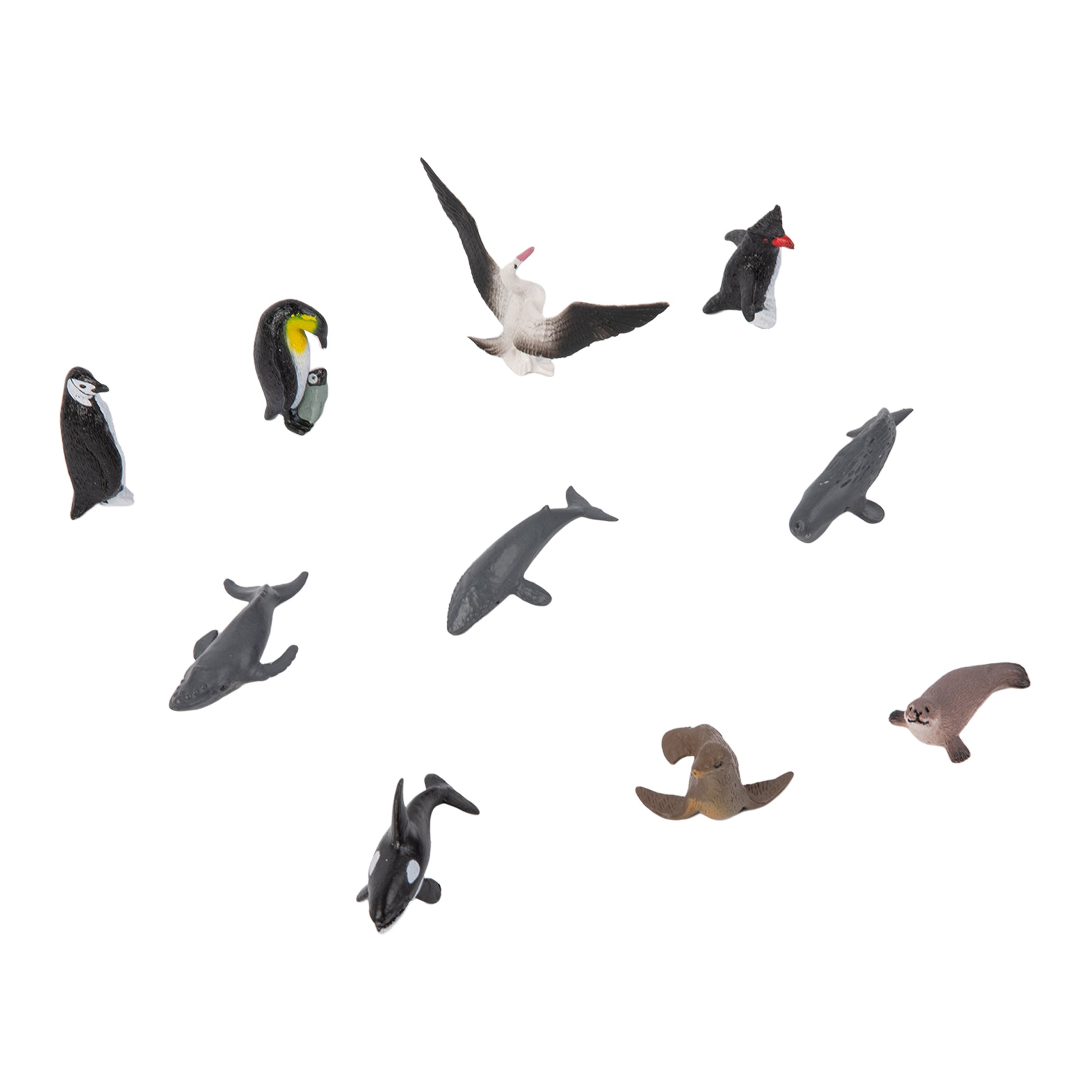 an emperor penguin, a chinstrap penguin, a rockhopper penguin, a blue whale, a humpback whale, a sperm whale, an orca, a crabeater seal, an Antarctic fur seal, and a wandering albatross.