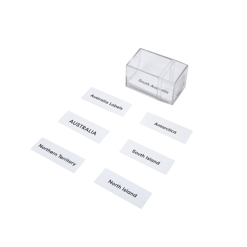 A set of labels printed with 14 states and territories names to be used with the Puzzle Map of Australia. Transparent plastic container included.