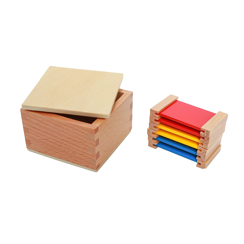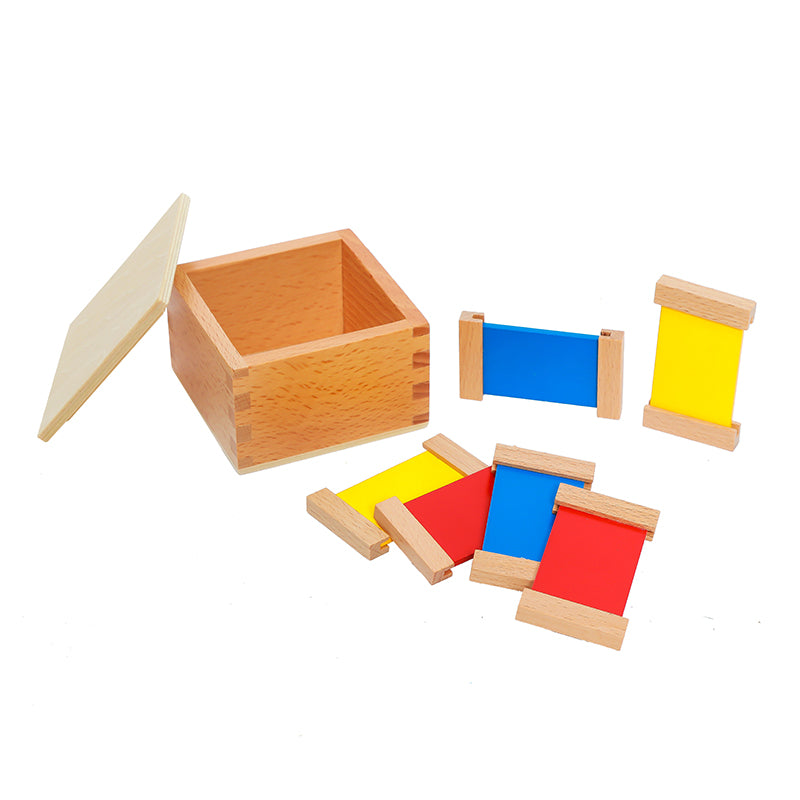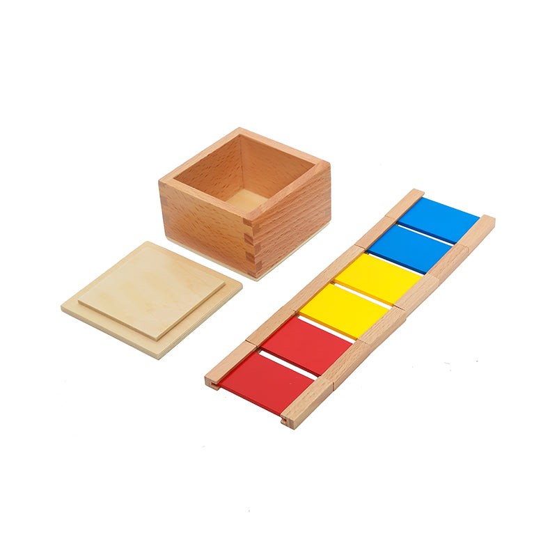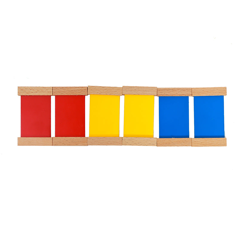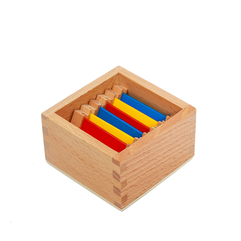 3 pairs of the primary colors: red, yellow and blue in a wooden box.