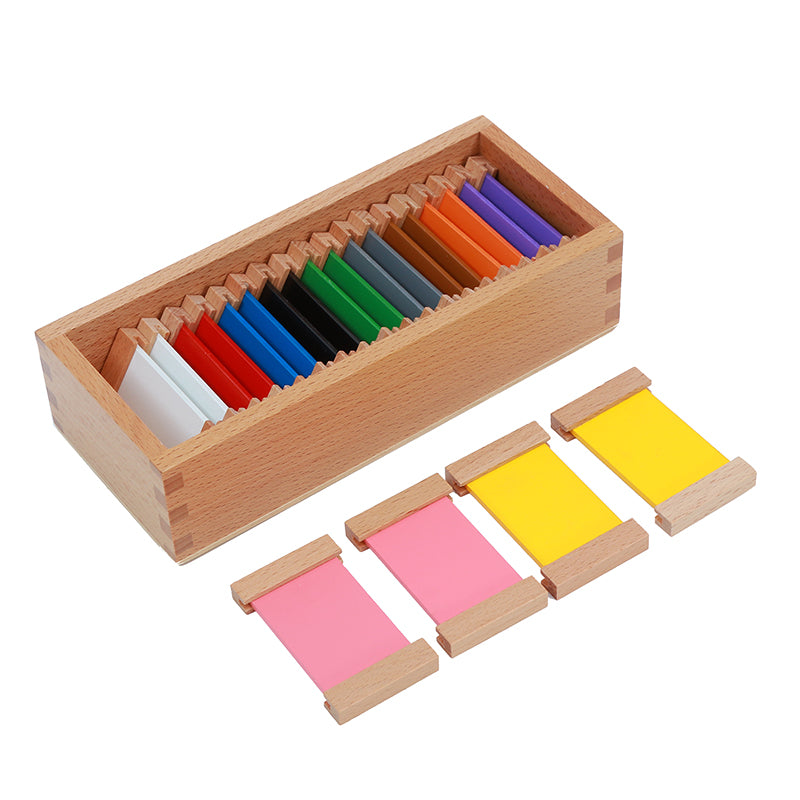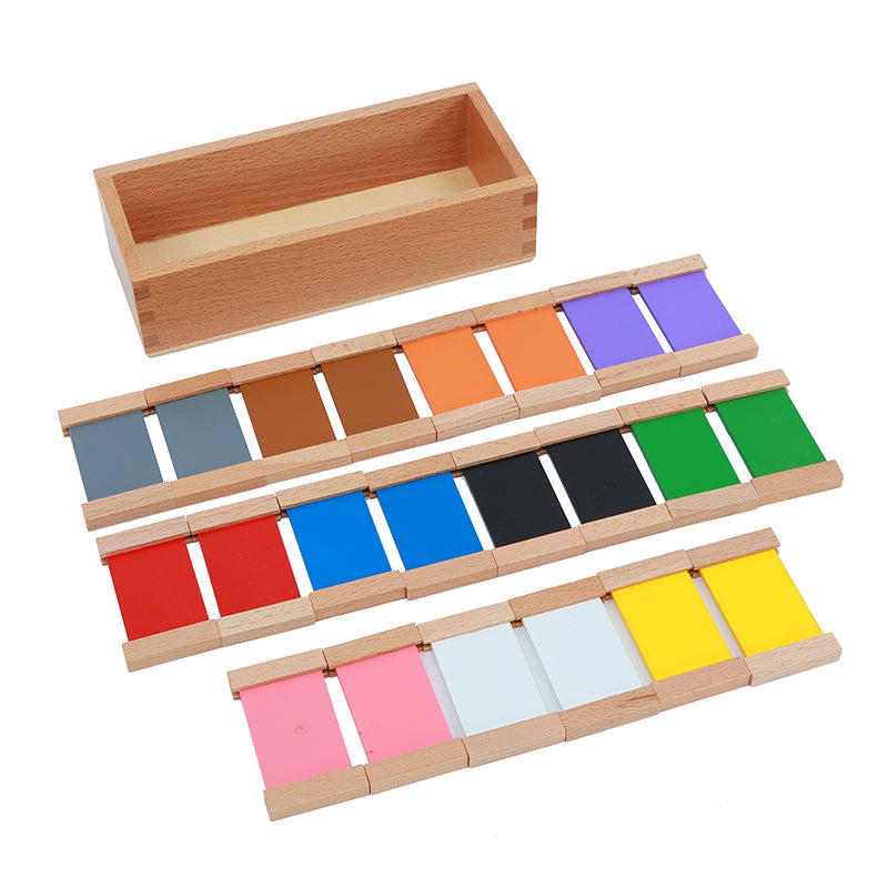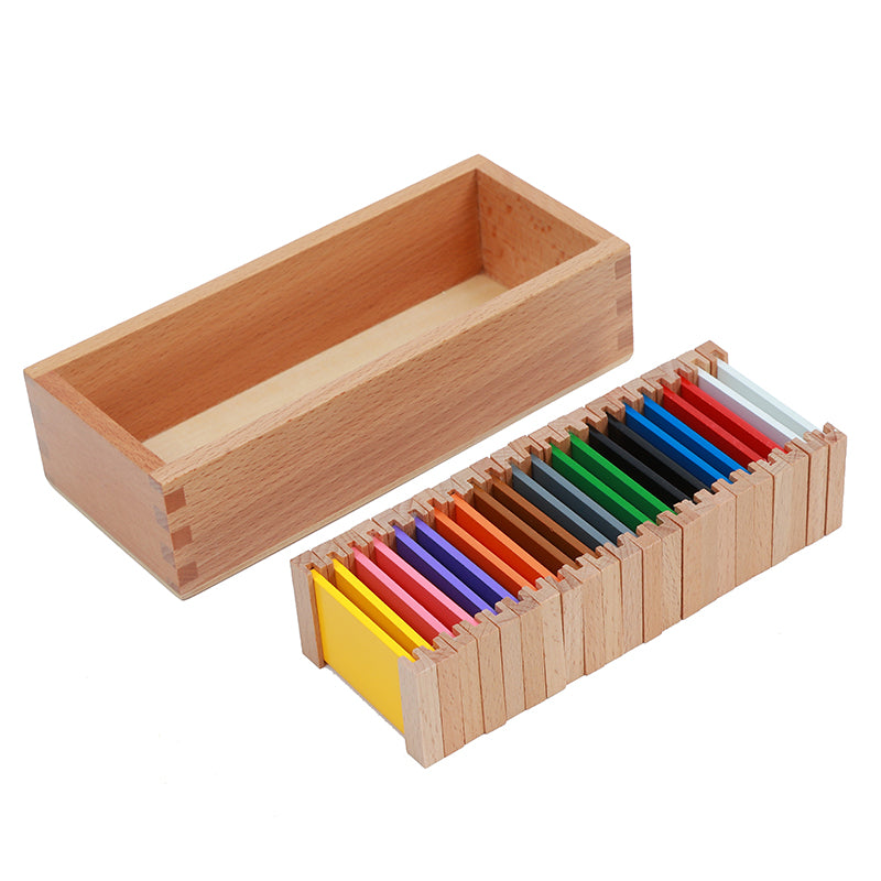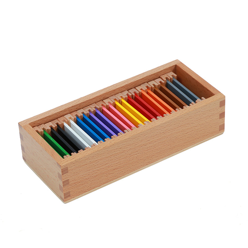 11 pairs of the colors: red, yellow, blue, orange, green, purple, brown, pink, grey, black and white in a wooden box.
