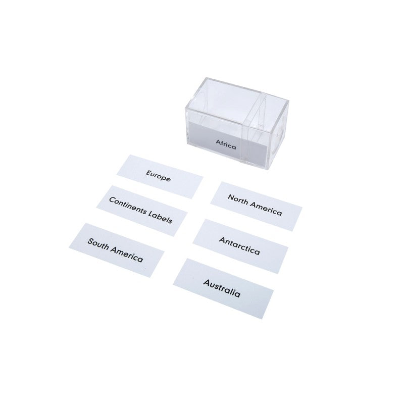 A set of labels printed with 7 continent names to be used with the Puzzle Map of World. Transparent plastic container included.
