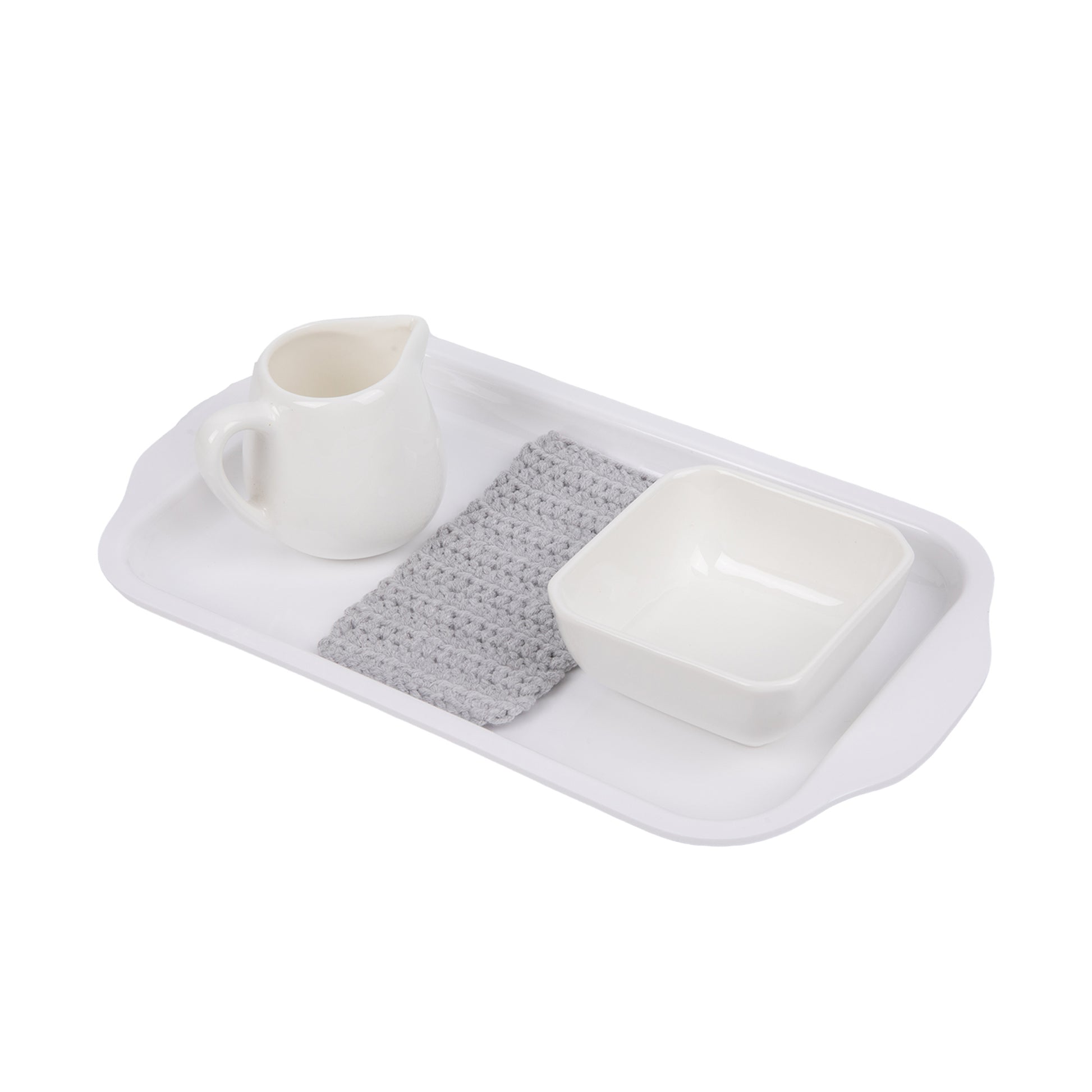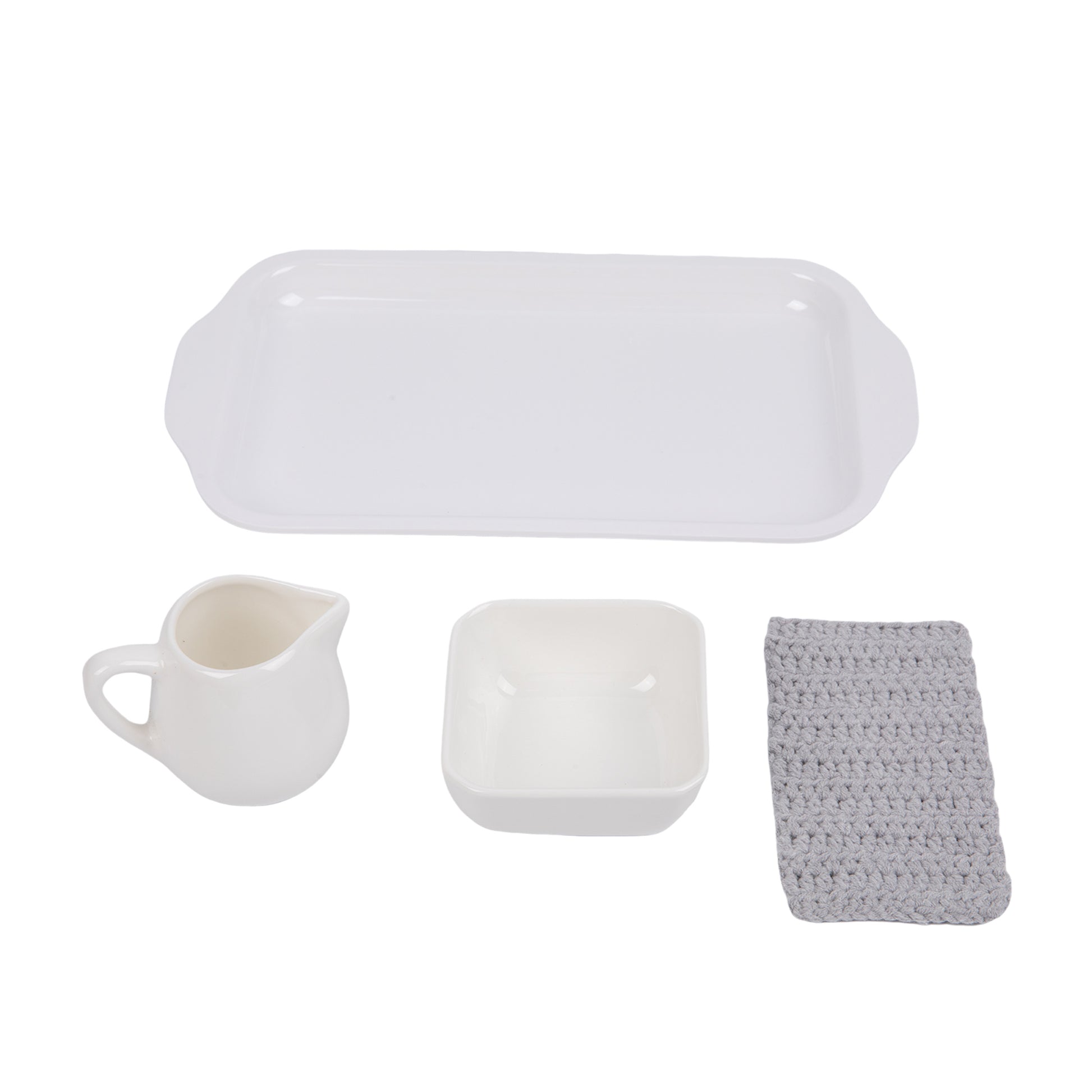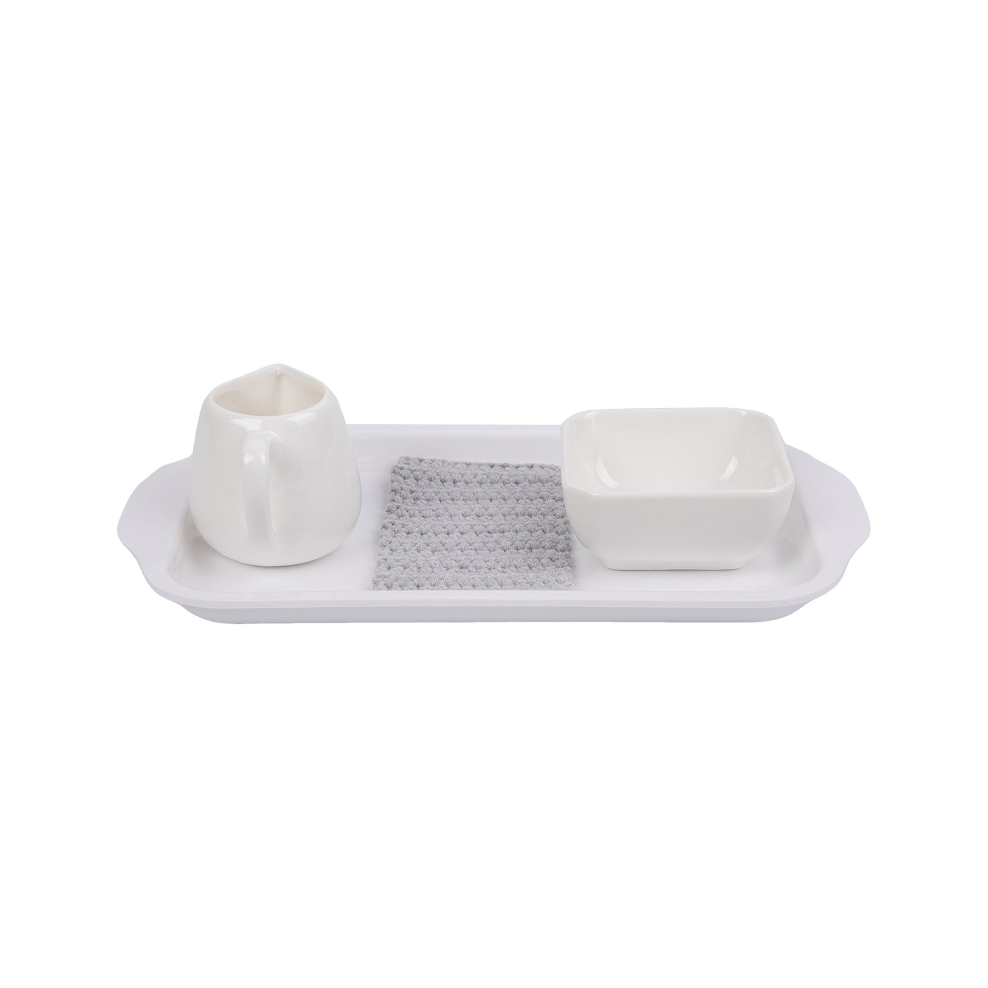 A plastic tray contains a ceramic jug, a fabric cloth and a tray.