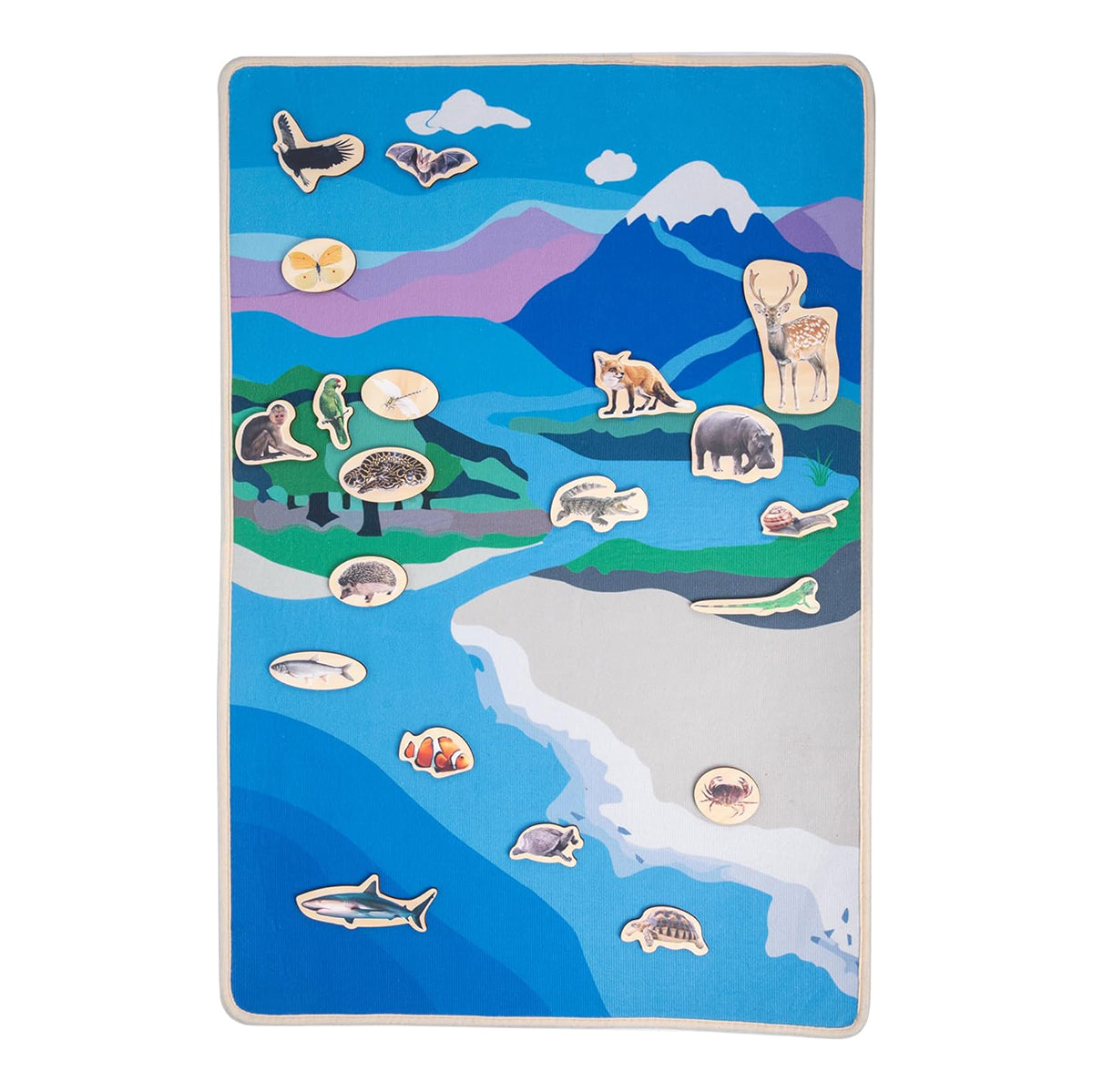 - 🌍🐾Montessori Water and Land Mat-It is an educational tool that engages young minds. It provides a rich geographical landscape that allows children to classify animals according to how they move: on land, in the air or in the water.