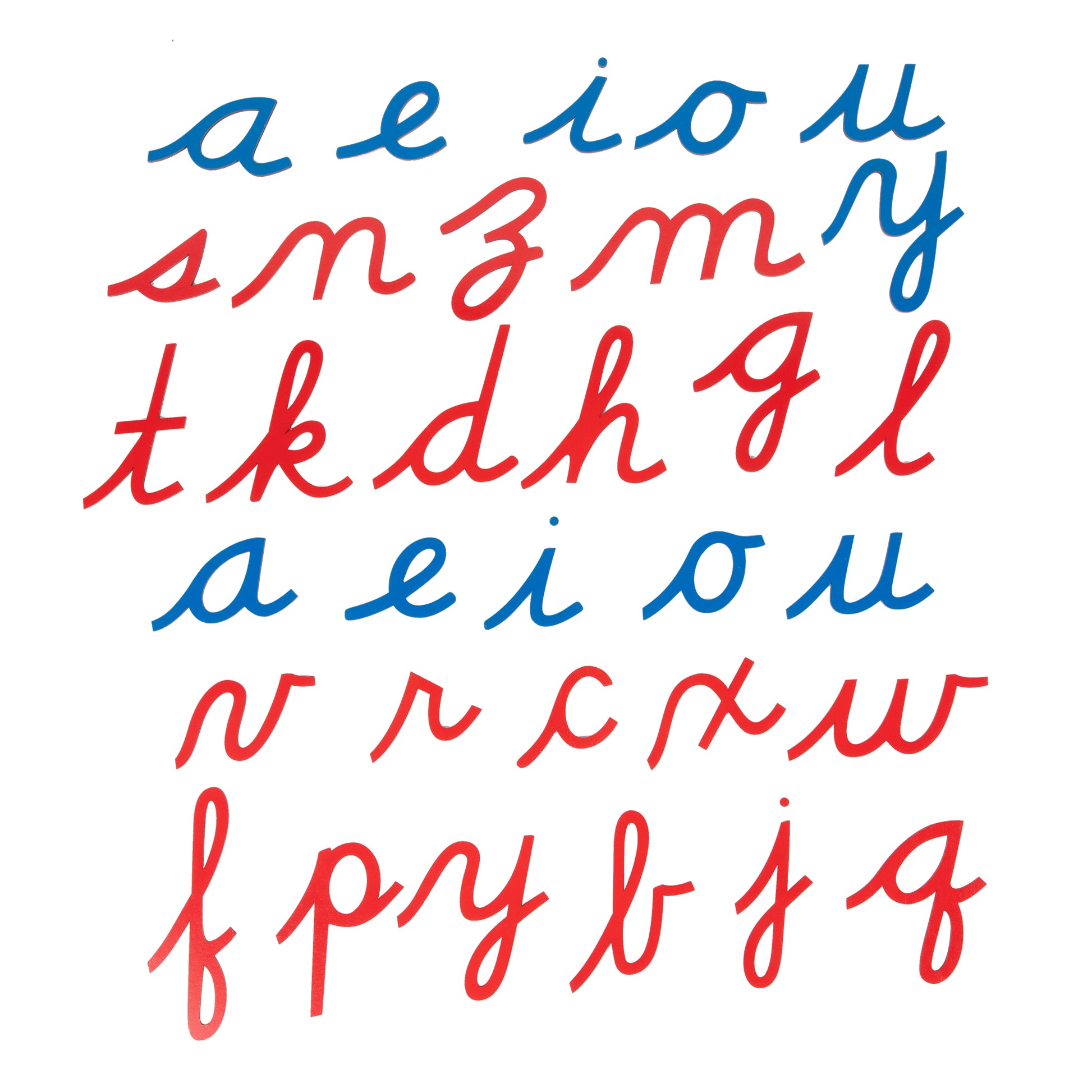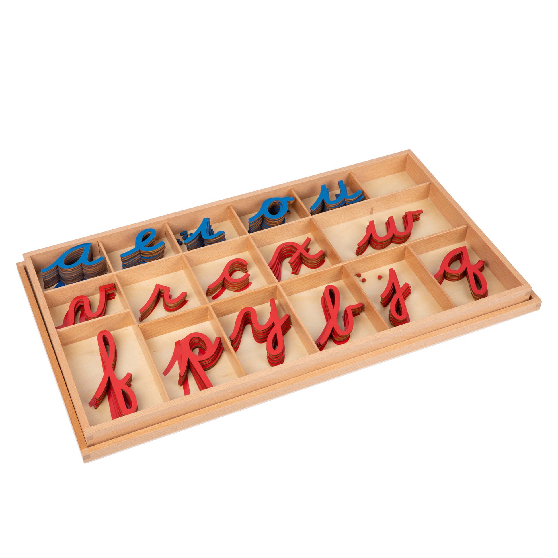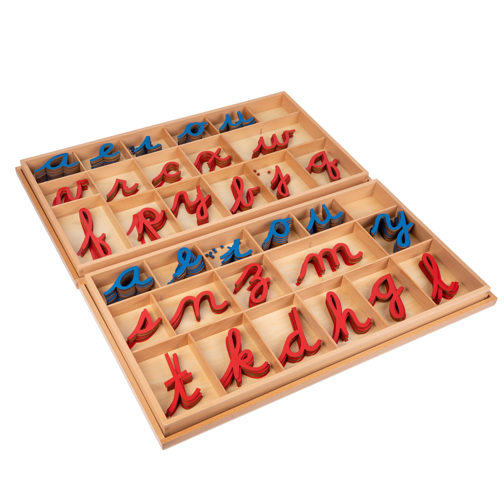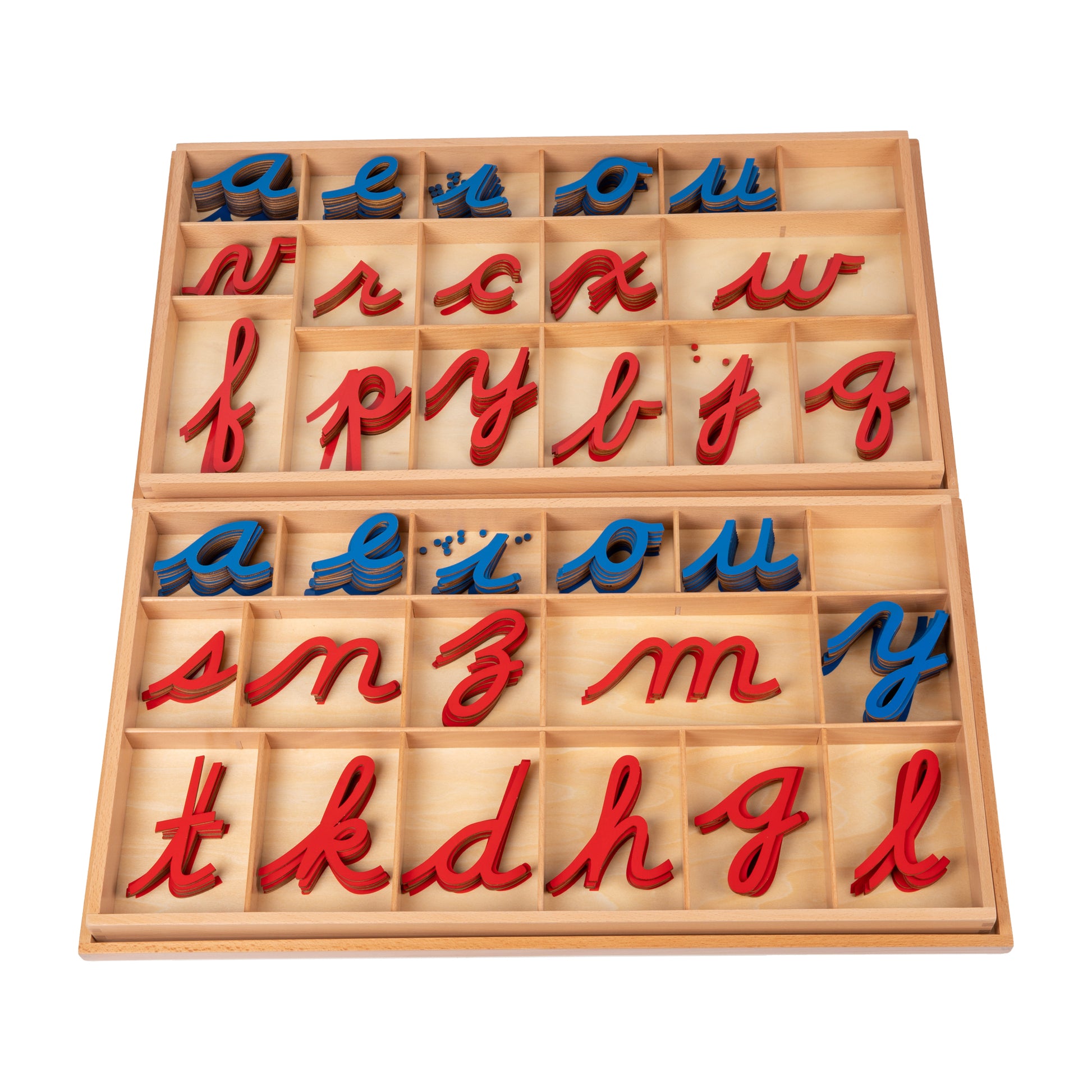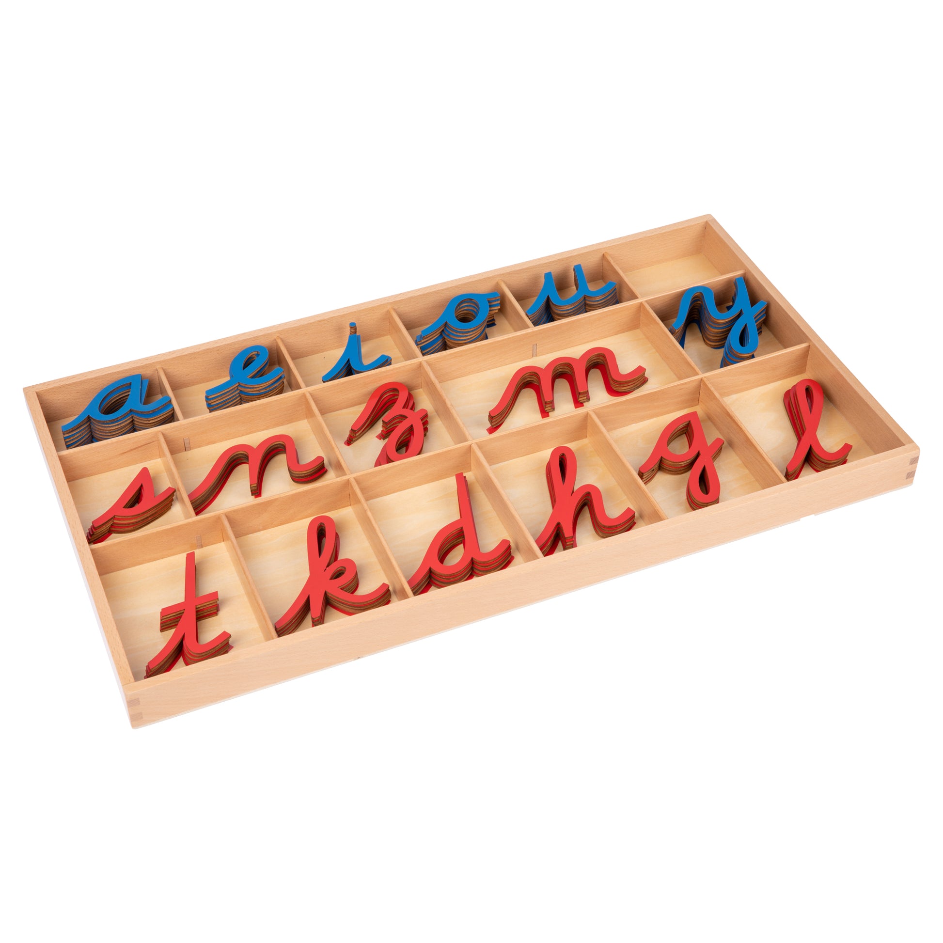 A wooden box containing 5 of each consonant in red and 10 of each vowel in blue. All letters are made of wood.