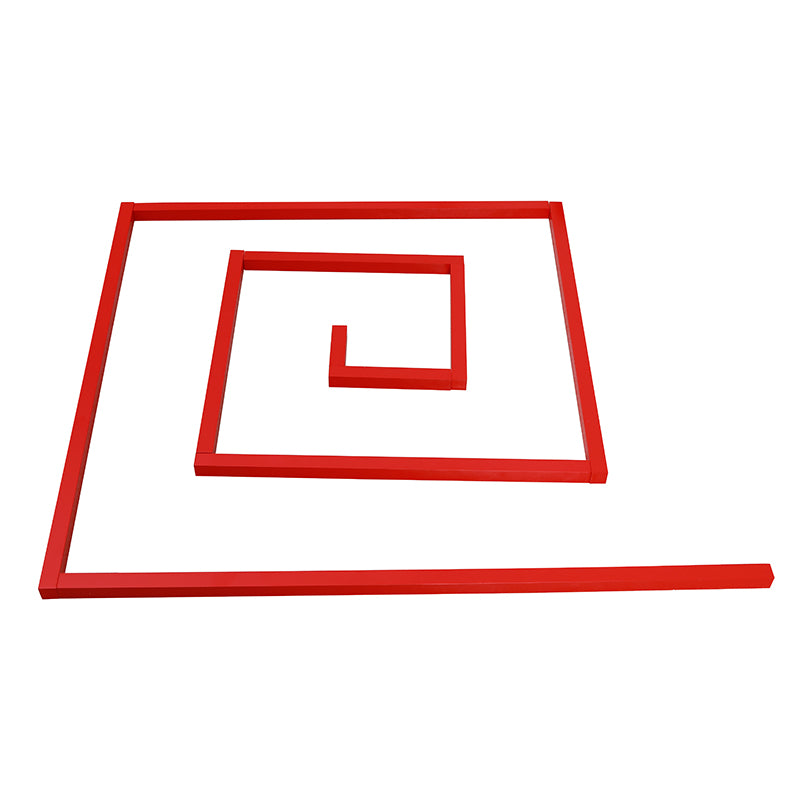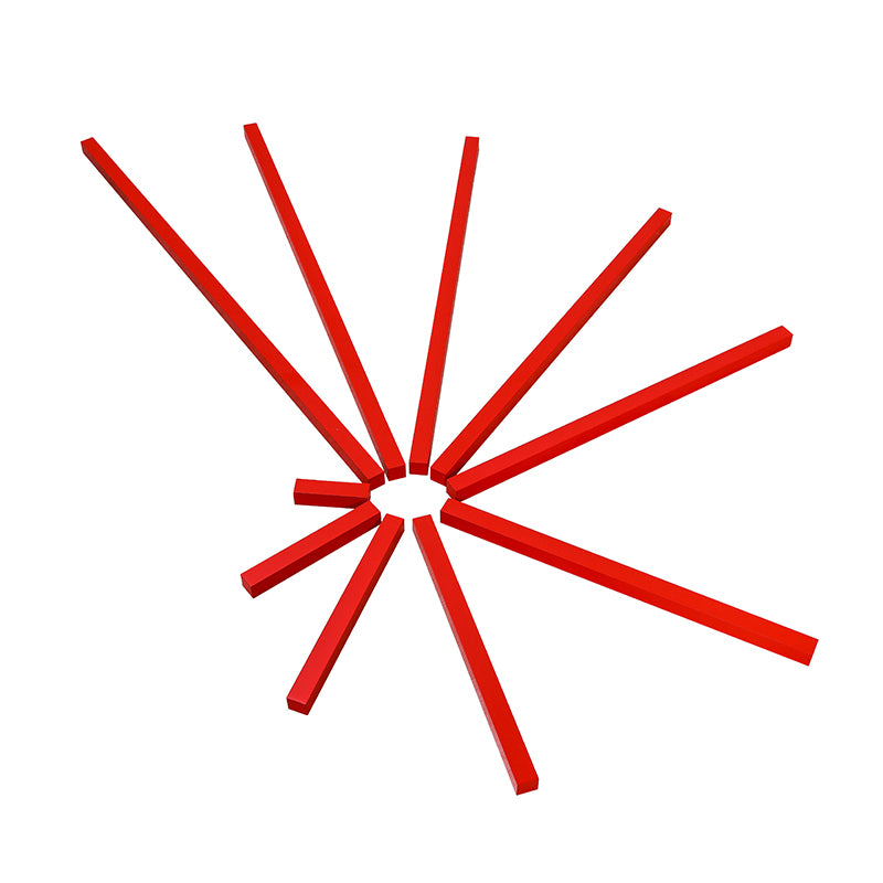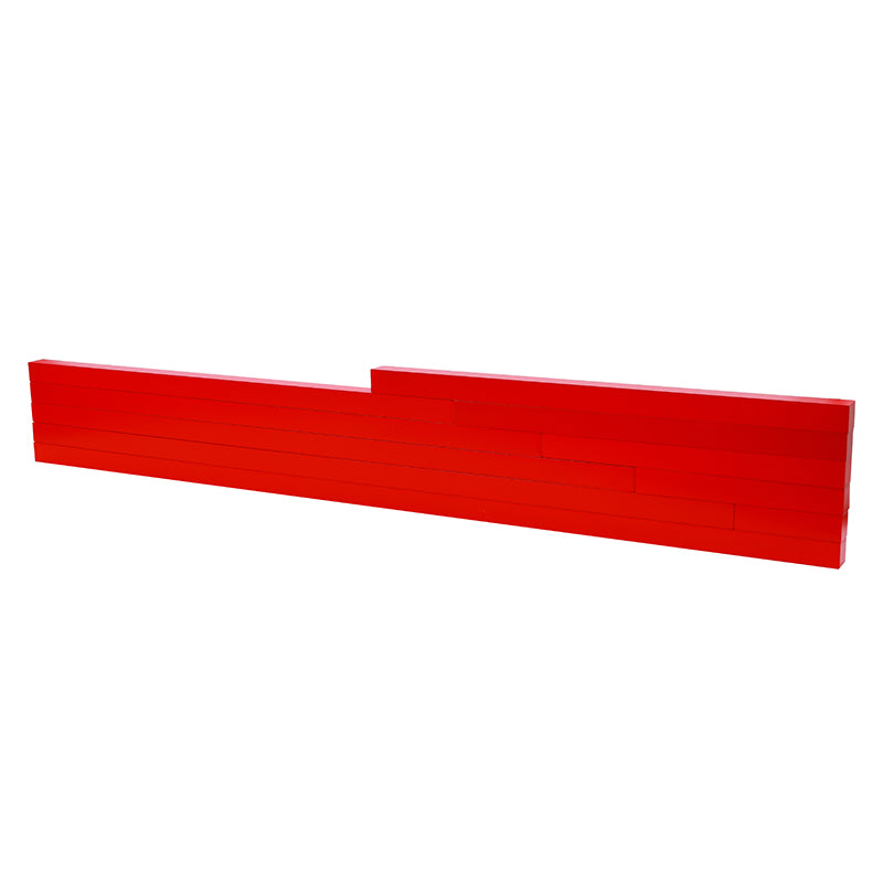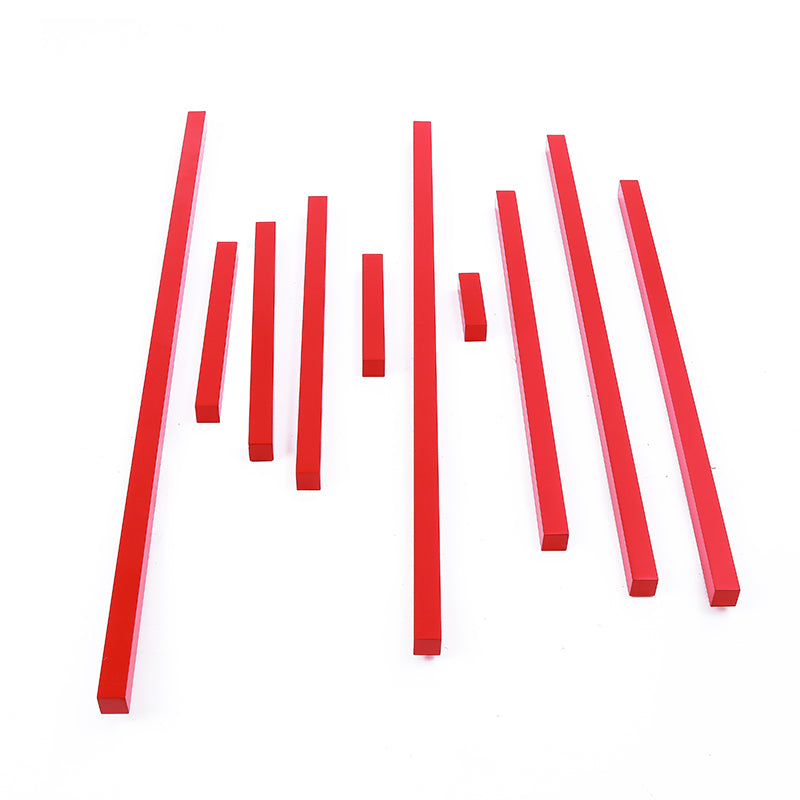 Ten solid long red wooden rods that are constant in height and width (2.5cm) while graduated in length from 10cm to 1 metre.