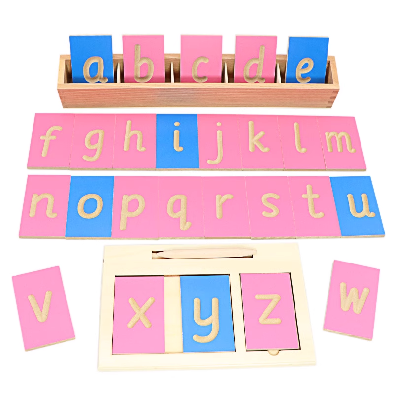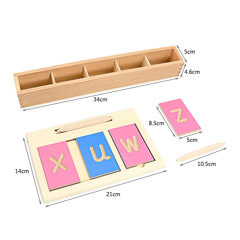 Tactile grooved letters with a stylus and wooden box, consonants on pink and vowels on blue boards. Each character is grooved out of the board to make an easily traceable shape for the finger or with a stylus for early pencil control.