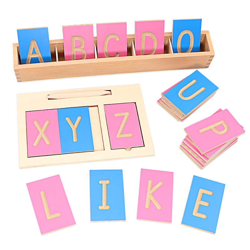 Tactile grooved letters with a stylus and wooden box, consonants on pink and vowels on blue boards. Each character is grooved out of the board to make an easily traceable shape for the finger or with a stylus for early pencil control.