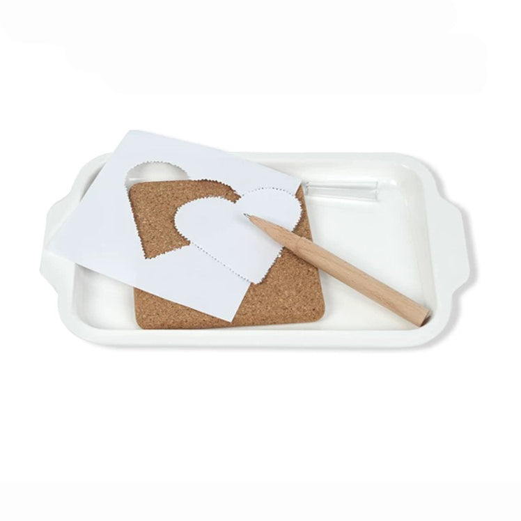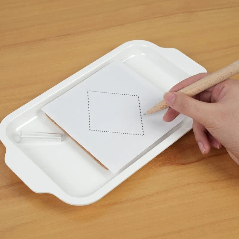 This complete early writing preparation kit includes a small white tray containing a square corkboard, one wooden-handle puncher with safety-designed stainless steel tip, and 80 illustrated pattern cards(8shapes)). Designed to develop pencil grip strength, fine motor control, and concentration through purposeful pinpunching activity.
