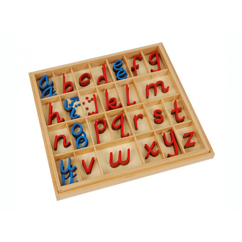 A wooden box containing 5 of each consonant in red and 10 of each vowel in blue. All letters are made of wood.