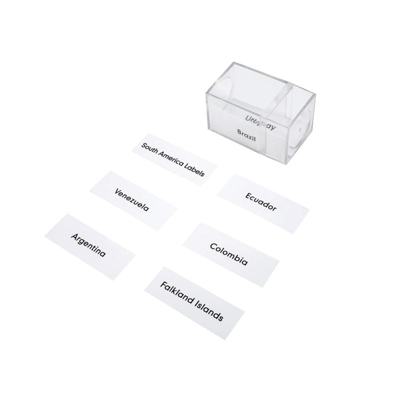 A set of labels printed with 12 countries names to be used with the Puzzle Map of South America. Transparent plastic container included.