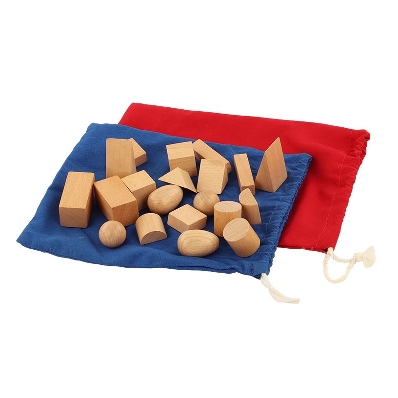 A cloth bag containing 10 pairs of smooth wooden shapes.