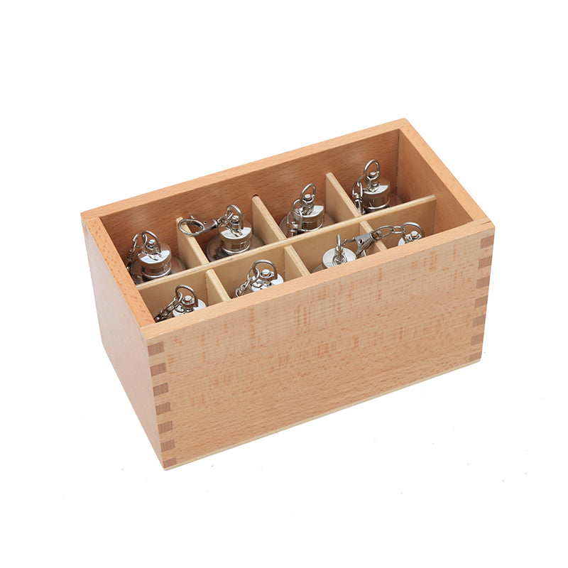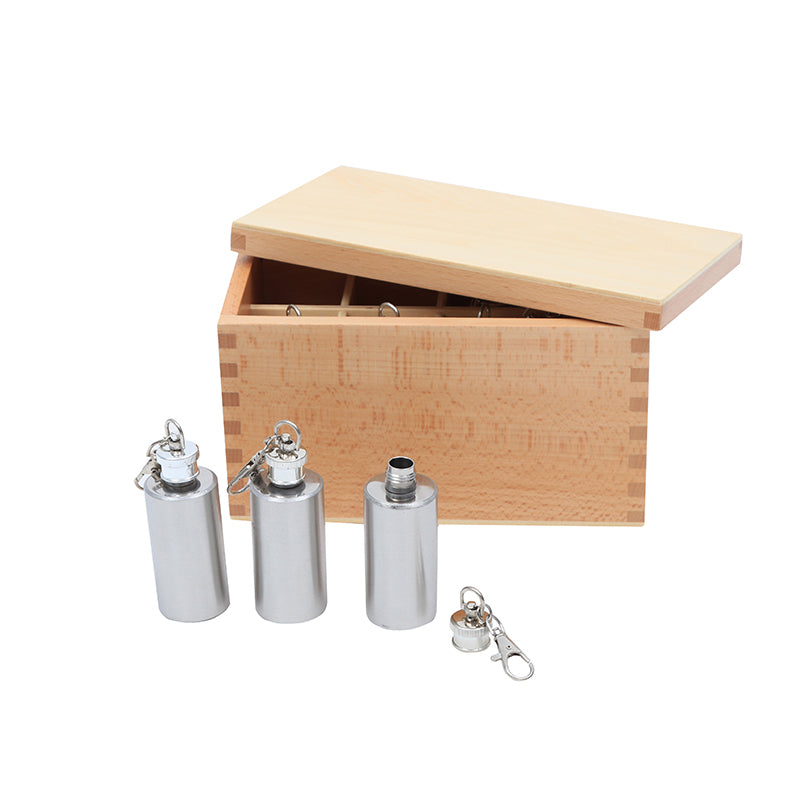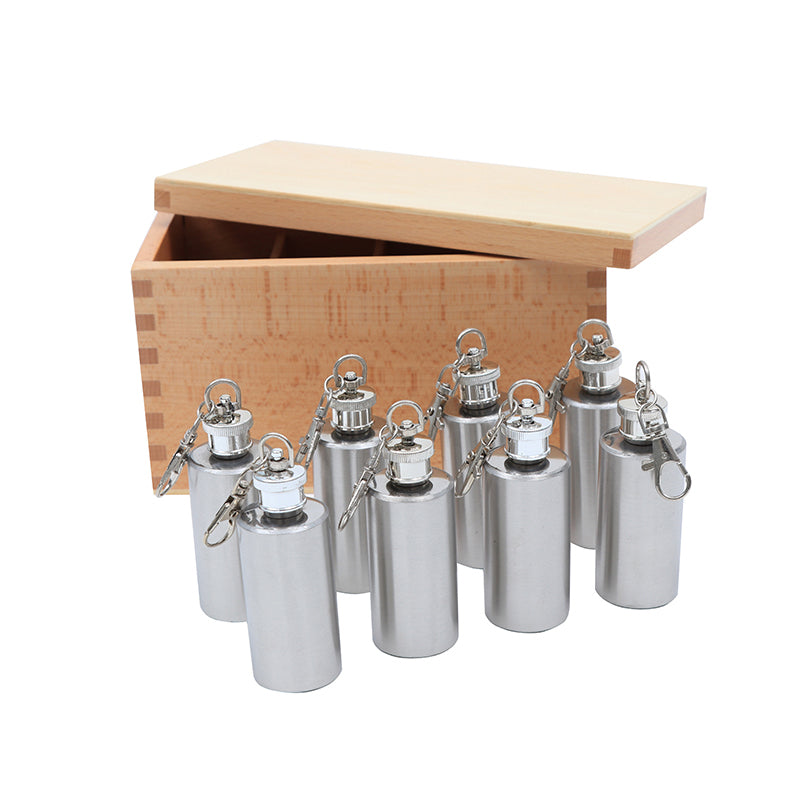 A wooden box with 8 compartments contains 4 pairs of empty stainless steel bottles. (bring your own water for operation)