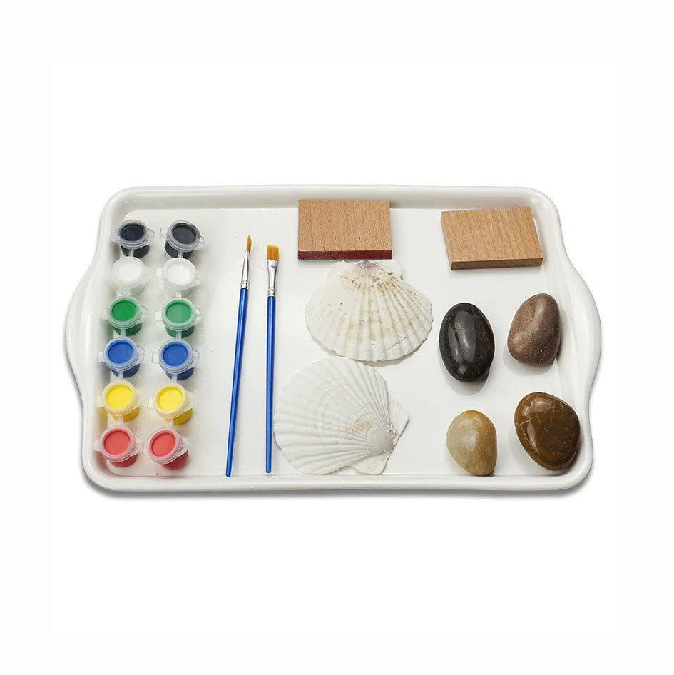 The set includes: imitation porcelain tray, 2 sets of six color pigments, 2 paintbrushes, 2 pieces of tree shells, and 2 wooden boards.
